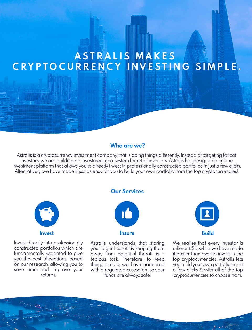 Investing has been associated with the ultra-wealthy 'fat cats' for too long. Everyday people have been excluded from investing due to an illusion of confusion created by economic jargon. Technology is changing this. Astralis believes investments should be simple and available for everyone, regardless of how big your wallet is.